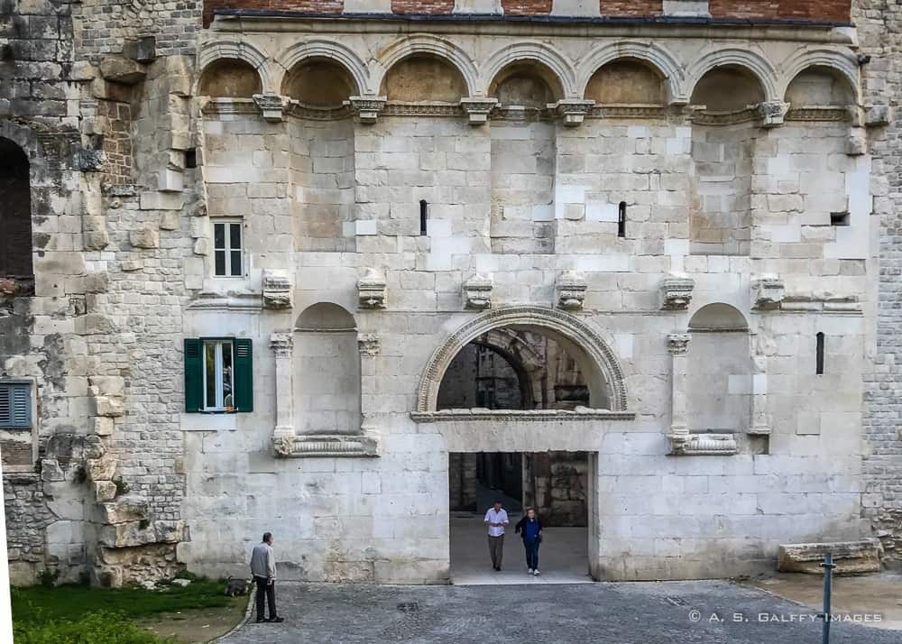 The walls on the Adriatic side were 72 feet (22 meters) high and 7 feet (2 meters) thick. The fortress had 16 towers (of which only 3 remain) and 4 gates: Porta Aurea (Golden Gate), Porta Argentea (Silver Gate), Porta Ferrea (Iron Gate), and Porta Aenea (Bronze Gate). The Golden Gate (Porta Aurea) was the main entrance to the palace which the emperor used when he entered his new home for the first time in June, 305 AD, after his abdication.
